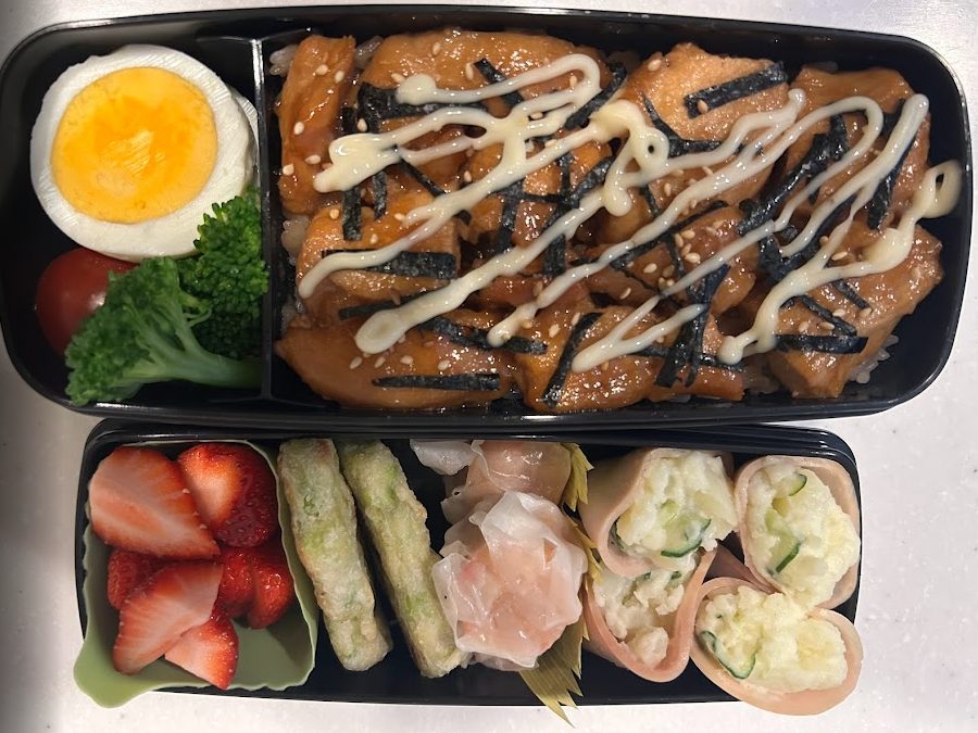 写真の照り焼きチキンは、夕食おかずの残りを冷凍していたものです。朝レンジでチンしてごはんの上にのせただけですが、簡単にガッツリ系のお弁当ができますよ。
